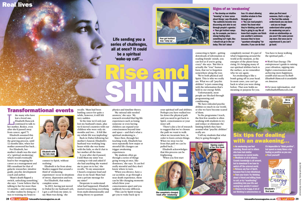 An interview with UK’s Fate & Fortune magazine about my spiritual awakening. How it happened, what excelled it, and how it affected my daughter too. It all began after my mother died and I started to hear her voice in my head. If you want to pick up tips on how to awaken your psychic gifts then read my first book Work Your Energy HERE.